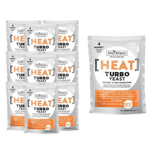 The only Turbo to use when the air temperature is above 33C. Heat Turbo Yeast can tolerate temperatures up to 40C. Delivers excellent quality alcohol in hot conditions. Due to its high temperature tolerance, Heat Yeast is also the best turbo to choose for `stacking `, i.e. multiple batches in the one fermenter.